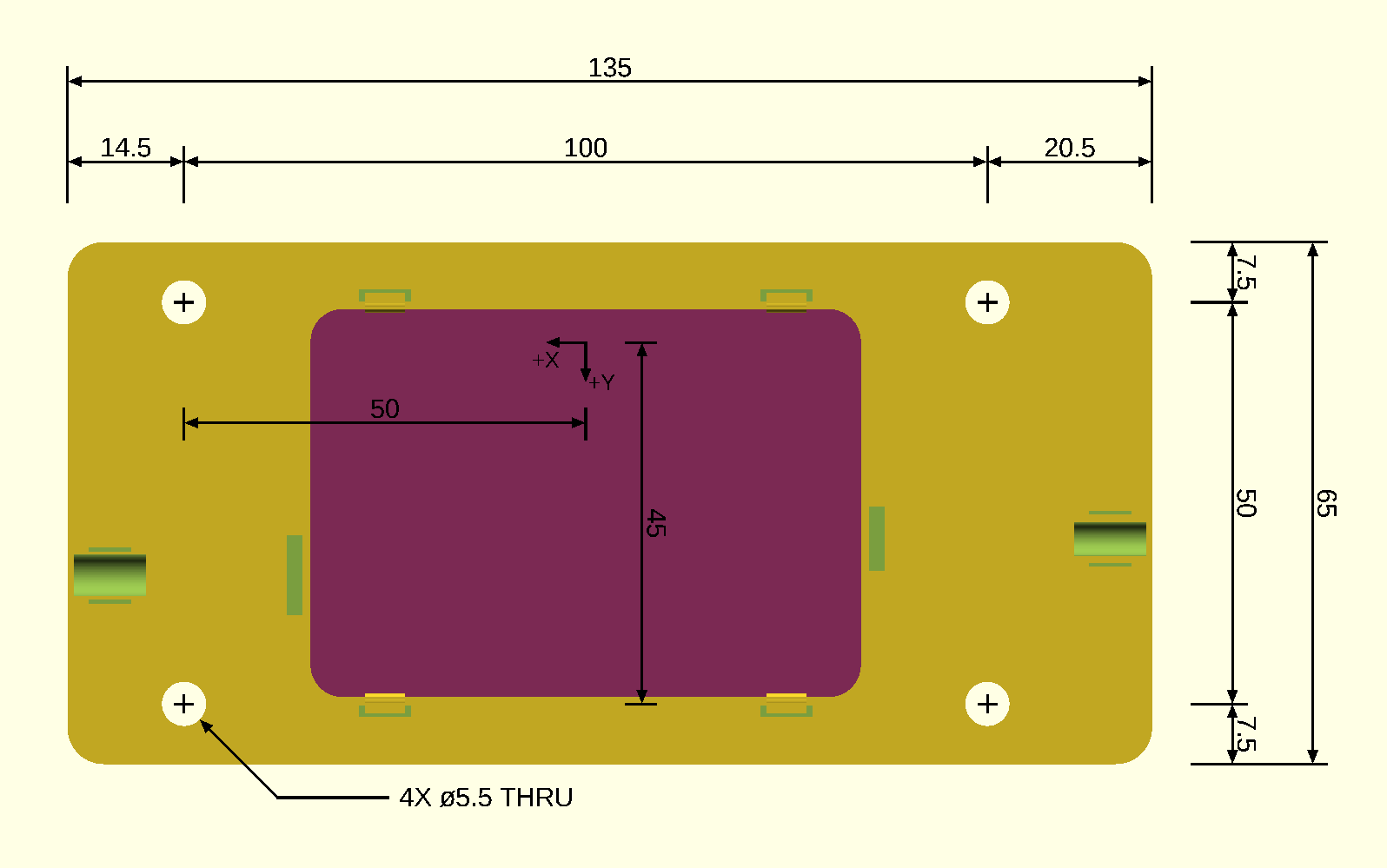 | Mechanical drawing of the 3D-printed mounting bracket supplied with the Infix-1 (units: mm) |