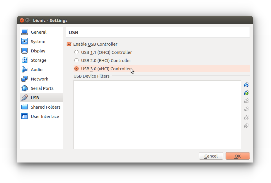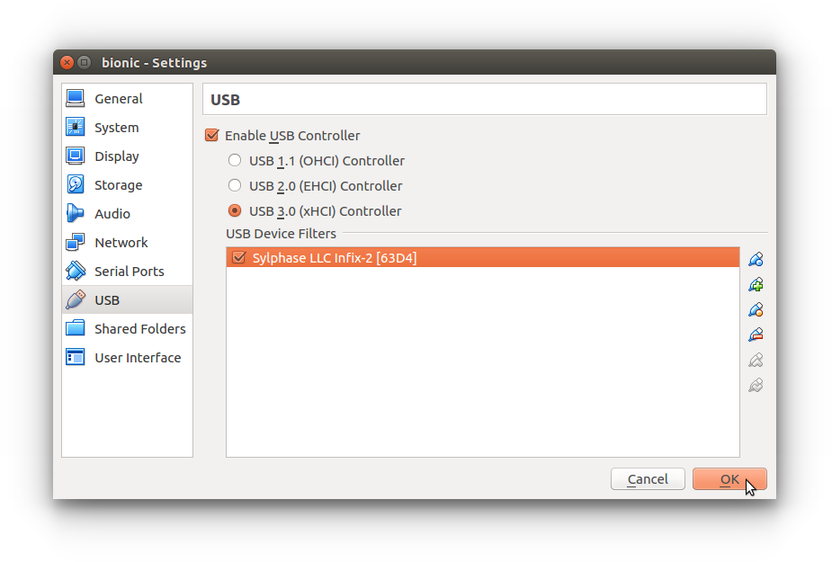 Note that the "USB 3.0 (xHCI) Controller" option ''must'' be chosen! VirtualBox's emulated USB 2.0 controller is known to be buggy and have issues with SDGPS.
