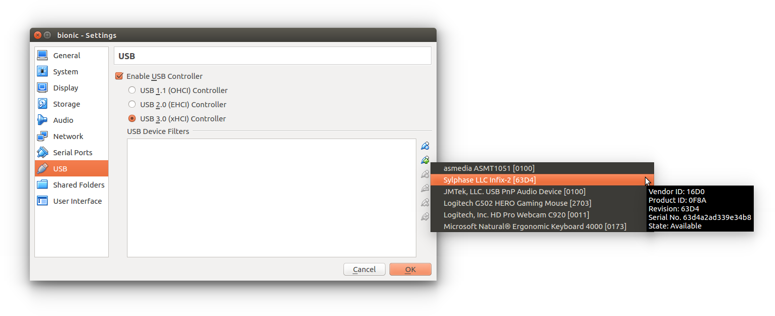 | Enabling USB 3.0 controller | Adding Infix-2 device filter |